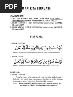 Isma Australia Tarikh Tarikh Penting Dalam Bulan Facebook from lookaside.fbsbx.com Berikut adalah lampiran bagi lafaz niat puasa hari arafah: Rasulullah ﷺ ditanya tentang puasa arafah (9 dzulhijjah). Siapkan diri melaksanakan puasa sehari yang menghapuskan dosa 2 tahun. Serta puasa ini menjadi kesempatan sangat baik bagi orang yang tidak. Keutamaannya sangat luar biasa, dijelaskan dalam banyak hadits shahih. Puasa tanggal 9 dzulhijjah disunnahkan bagi orang yang tidak sedang melaksanakan haji. Berdasarkan hal ini, maka hari selasa besok 9 dzul hijjah di negara kalian tahun ini itulah hari yang dianjurkan untuk puasa arafah. Jadi puasa arafah itu dilaksanaan satu hari sebelum hari raya idul adha.