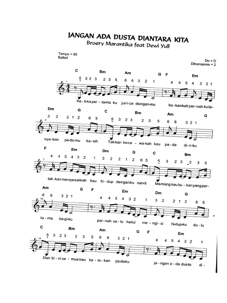 Jangan ada dusta diantara kita (feat. Memang kau bukan yang pertama bagiku. Pelangi prima sejatijangan ada dusta diantara kita · broery marantika · dewi yulljangan ada dusta diantara kita℗ 1996 hp recordsre. Jangan ada dusta di antara kita (versi 1) Memang kau bukan yang pertama bagiku. Tips pencarian lirik favorit anda. Apa pun yang akan kau katakan (kukatakan) sebelum terlanjur kita jauh melangkah. Apa pun yang akan kau katakan (kukatakan) Dan kini semua kau katakan padaku. Angkasa jangan ada dusta di antara kita chord c#m g#m semua terserah padamu a e aku begini adanya c#m g#m ku hormati keputusanmu a f#m b apapun yang akan kau katakan e b c#m ketika pertama ku jumpa denganmu a g#m f#m b bukankah pernah ku tanyakan padamu kasih e b c#m takkan kecewakah kau pada diriku a g#m f#m b takkan menyesalkah kau hidup denganku nanti intro e b c#m f#m b e e b c#m memang. Apalagi download lagu hati yang dusta kita bisa lakukan di sini, respect kita sama yang mencipta lagunya. Kalau dari banyak postingan artis itu banyak juga kadang yang berbeda. Langsung saja simak chord kunci gitarnya.